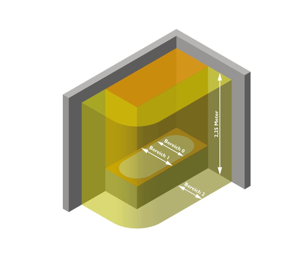 Außerhalb dieser definierten Bereiche dürfen Leuchten ohne höhere Schutzart montiert werden.