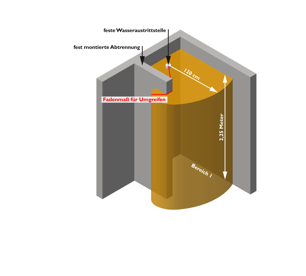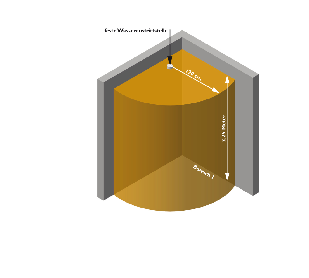 Der Schutzbereich 1 beschreibt eine Fläche rund um Badewanne oder Duschtasse. Der Bereich gilt vom Boden aus senkrecht bis auf eine Höhe von 2,25 Meter. Gibt es keine Wannen, so gilt ein Radius von 120 Zentimeter rund um den Brausekopf in seiner Halterung. Hier sind nur Leuchten mit bis zu 12 Volt Schutzkleinspannung erlaubt. Die Schutzart dieser Leuchten muss mindestens IP X4 entsprechen - also Spritzwasserschutz. Installation von Transformatoren ist in diesem Bereich nicht erlaubt.